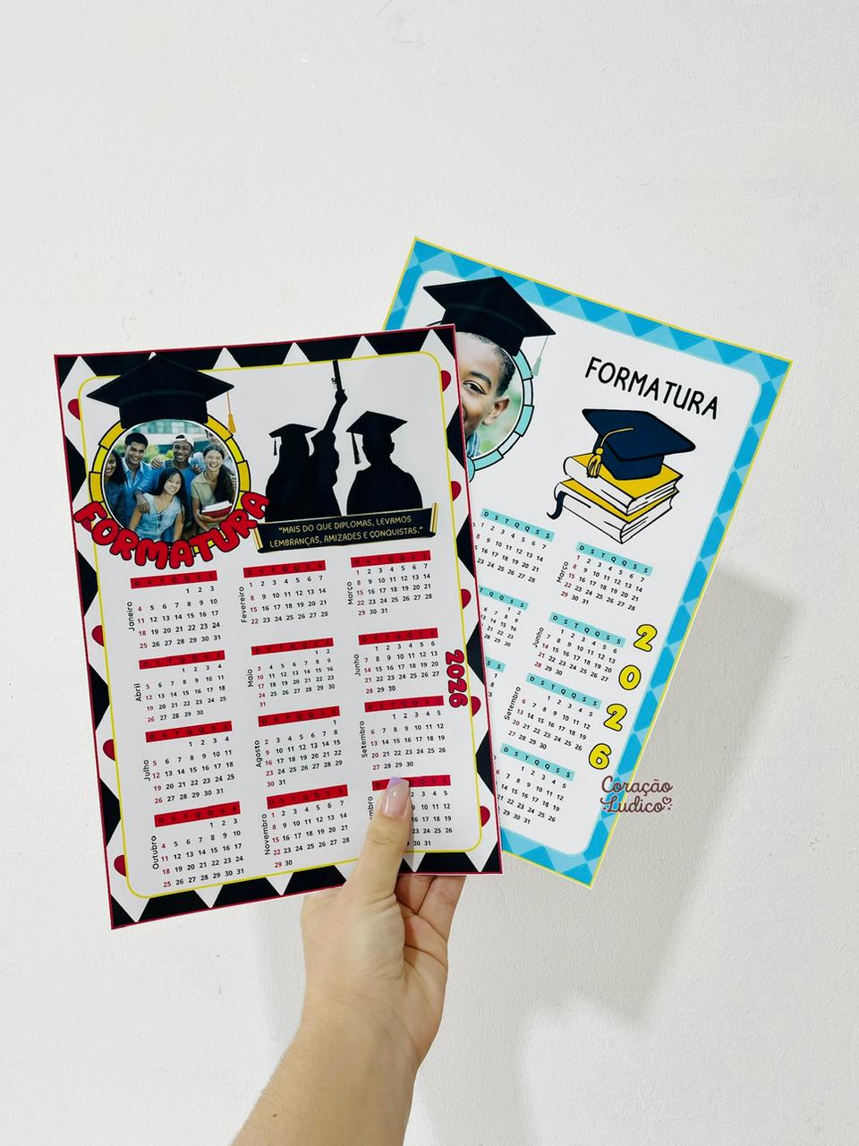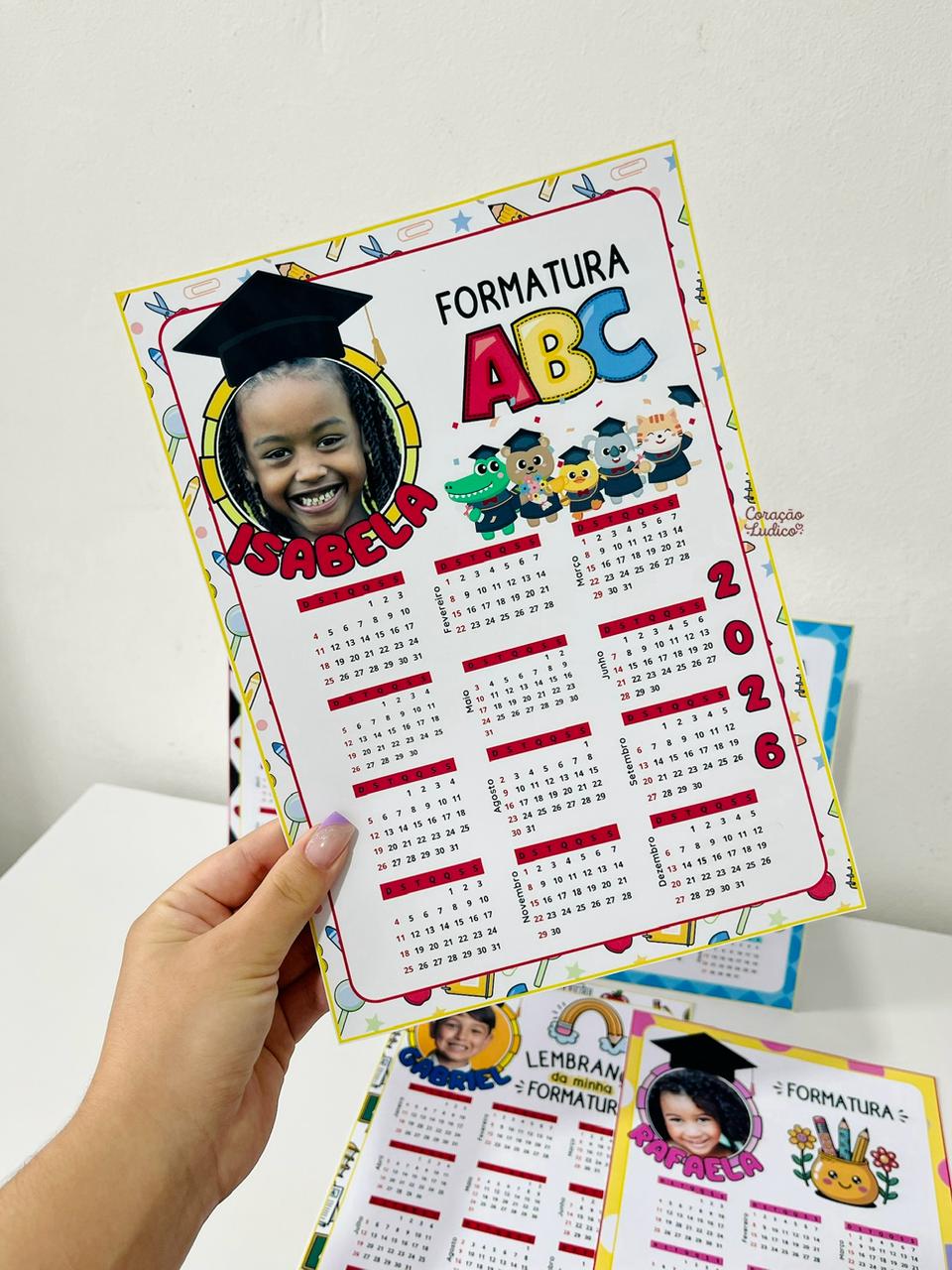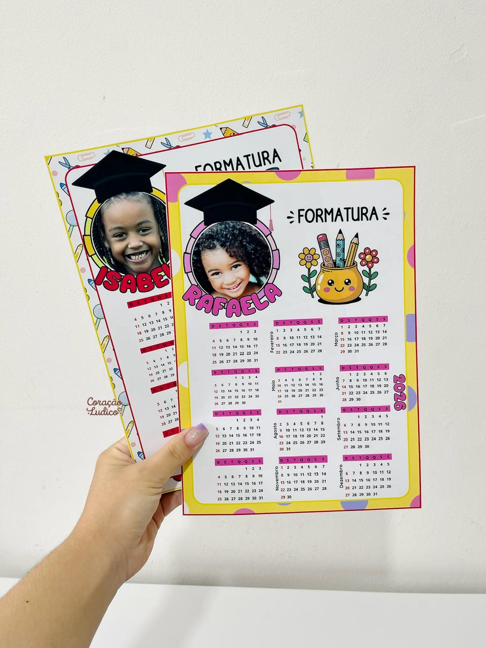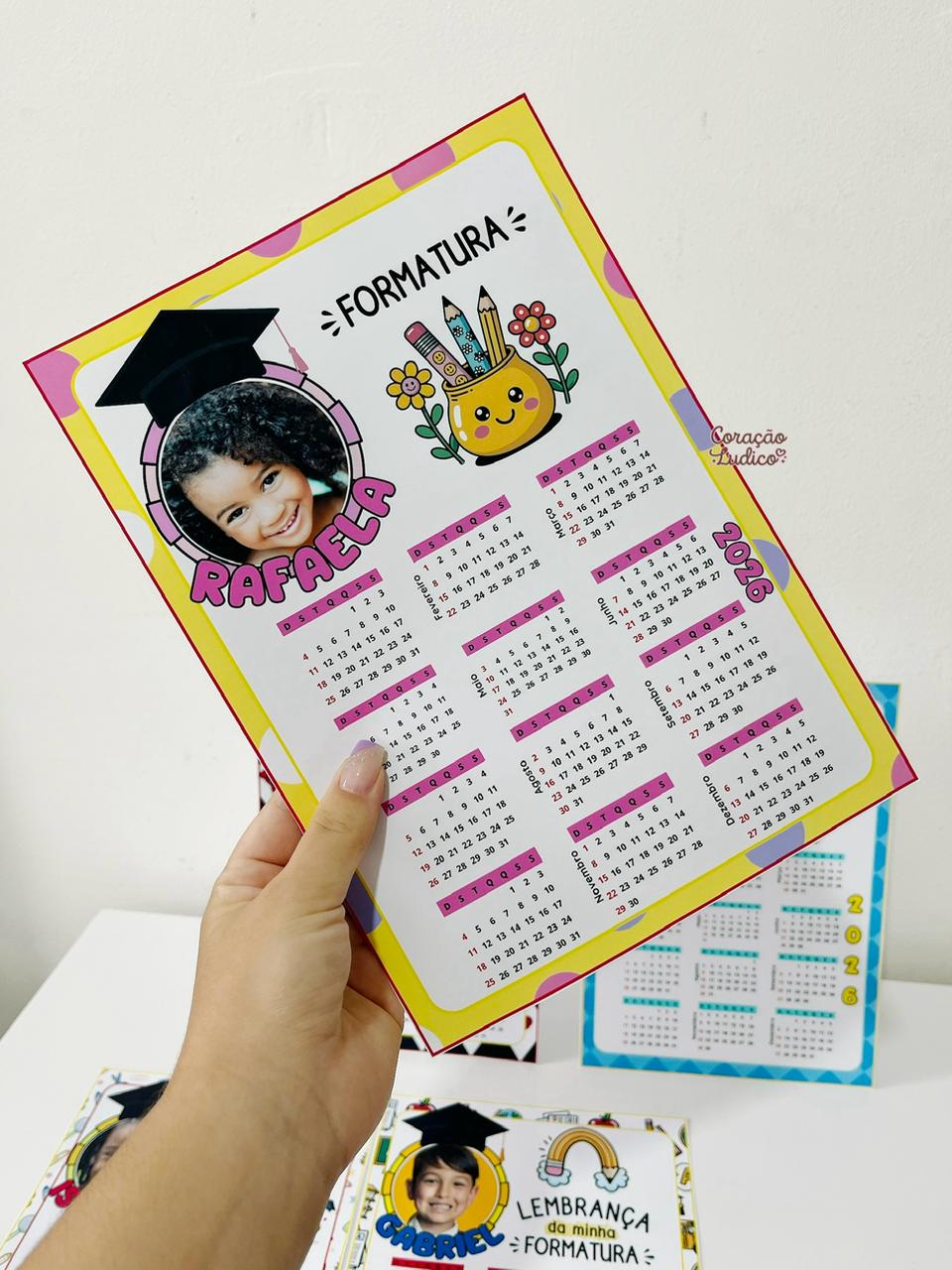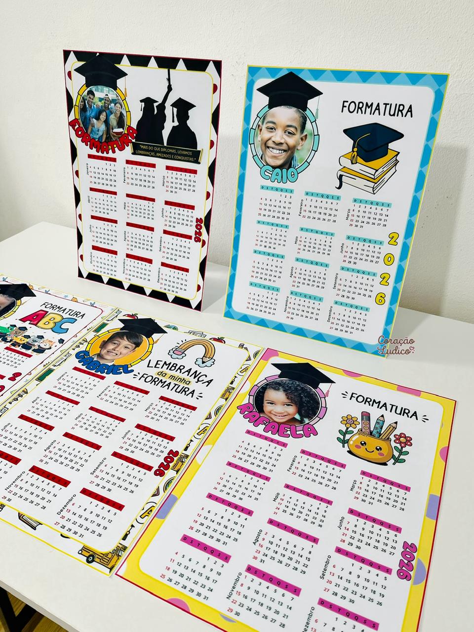Este arquivo contém 5 modelos lindos e super fofos, todos em tamanho A4, prontos para você editar com a foto dos alunos e criar um calendário perfeito para entregar na formatura.