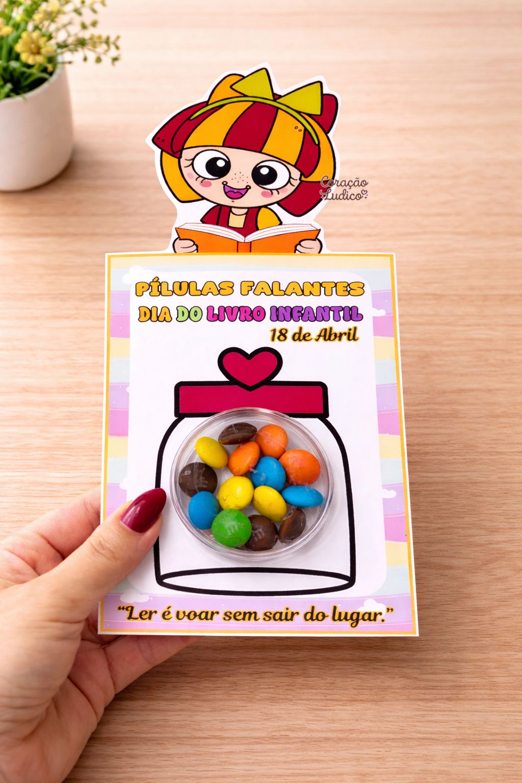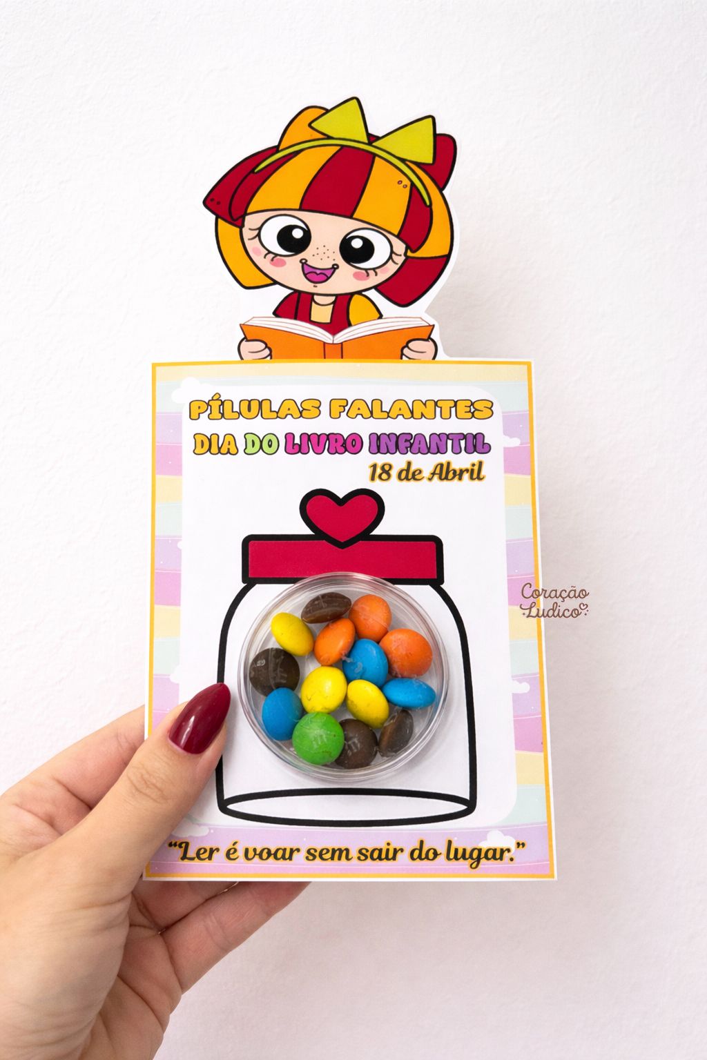 O cartão “Pílulas Falantes” é uma lembrancinha divertida que estimula o amor pela leitura de forma lúdica e especial.