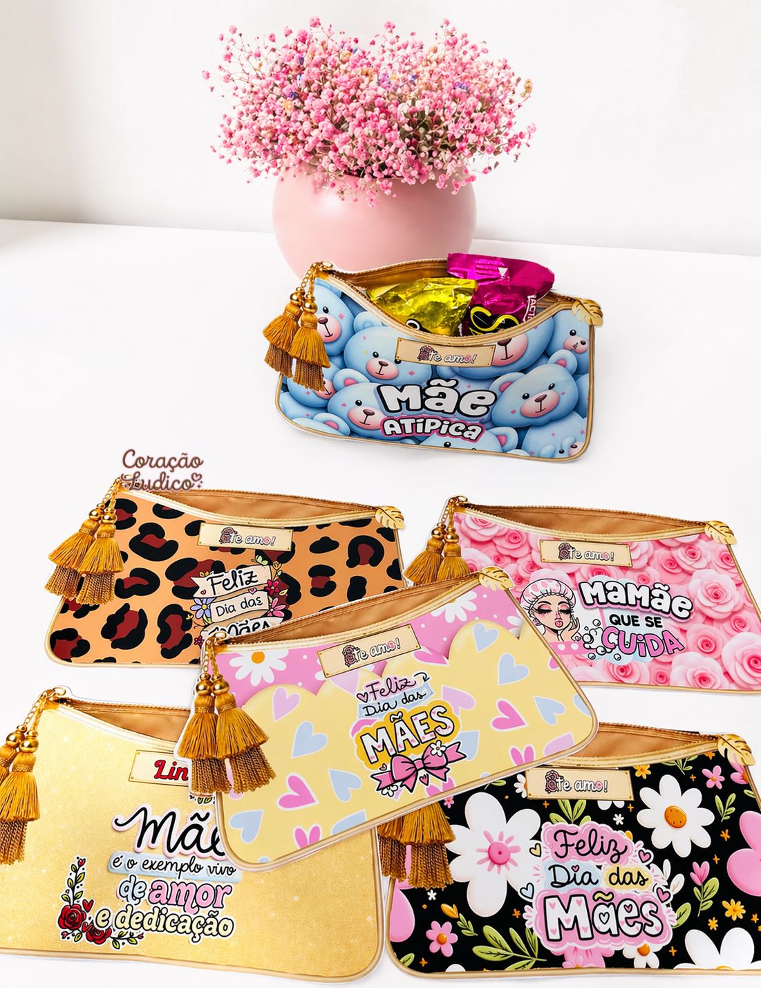 6 modelos com estampas delicadas e cheias de carinho, são ideais para maquiagem, itens pessoais ou lembrancinhas.