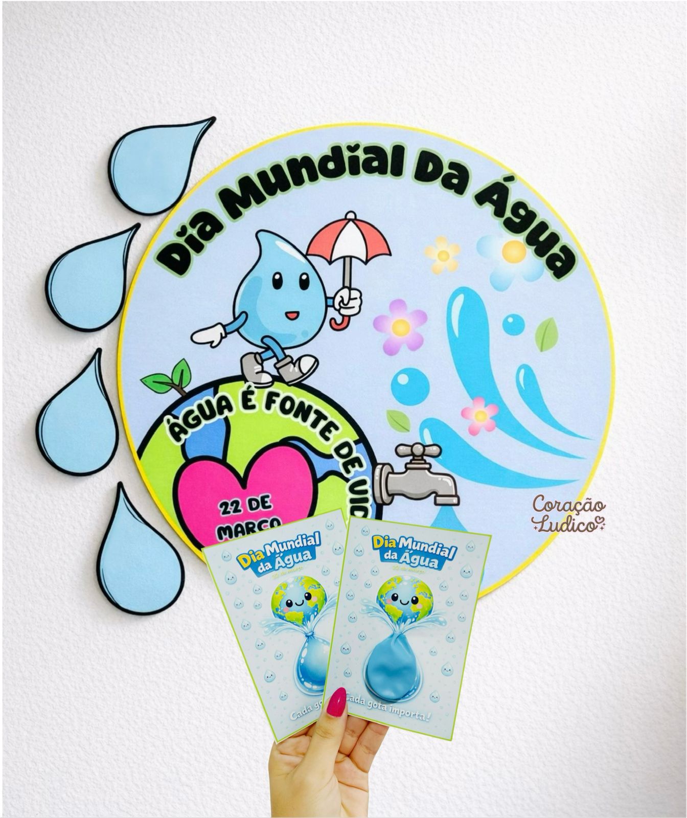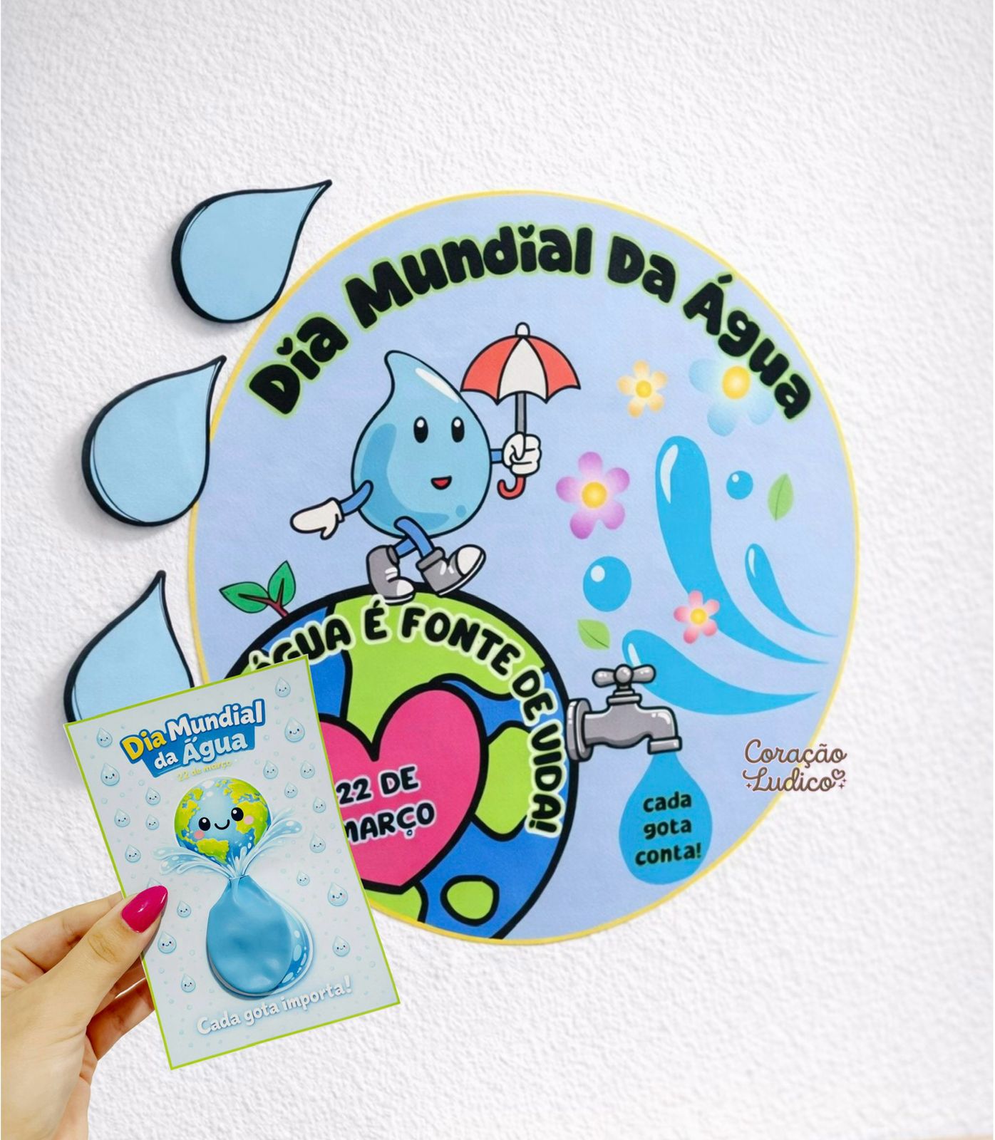 Além de decorar a sala, o painel pode ser colaborativo, pois acompanha gotinhas em branco para os alunos escreverem ações para economizar água.