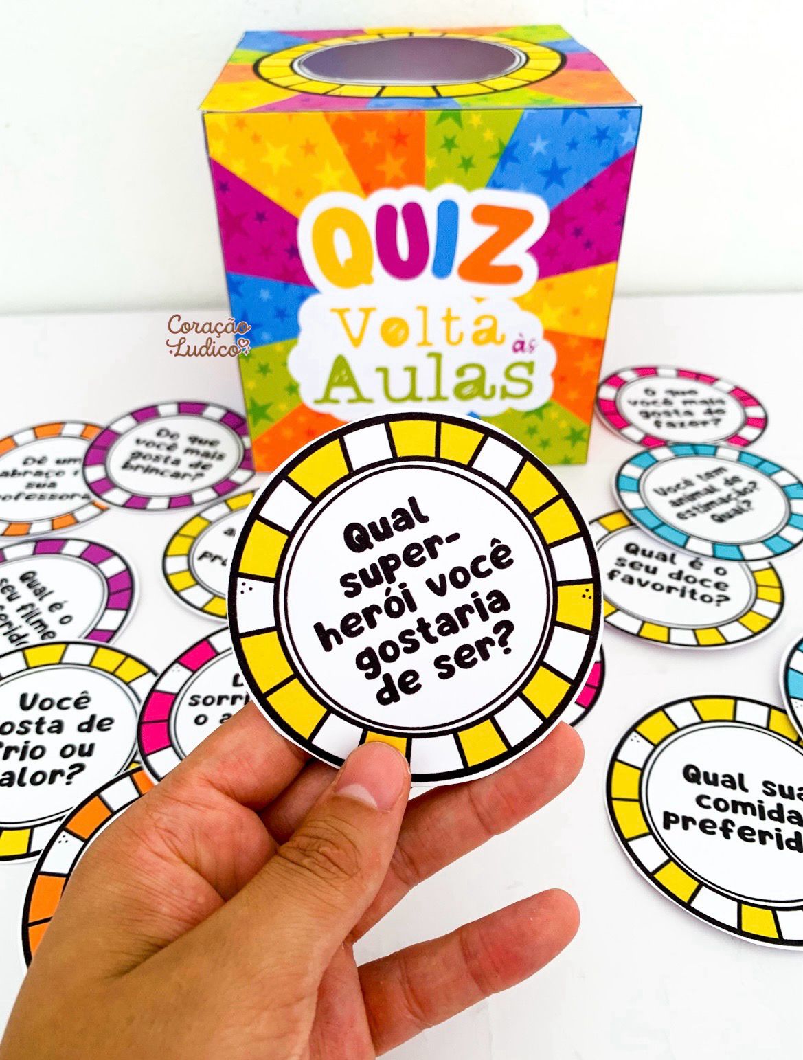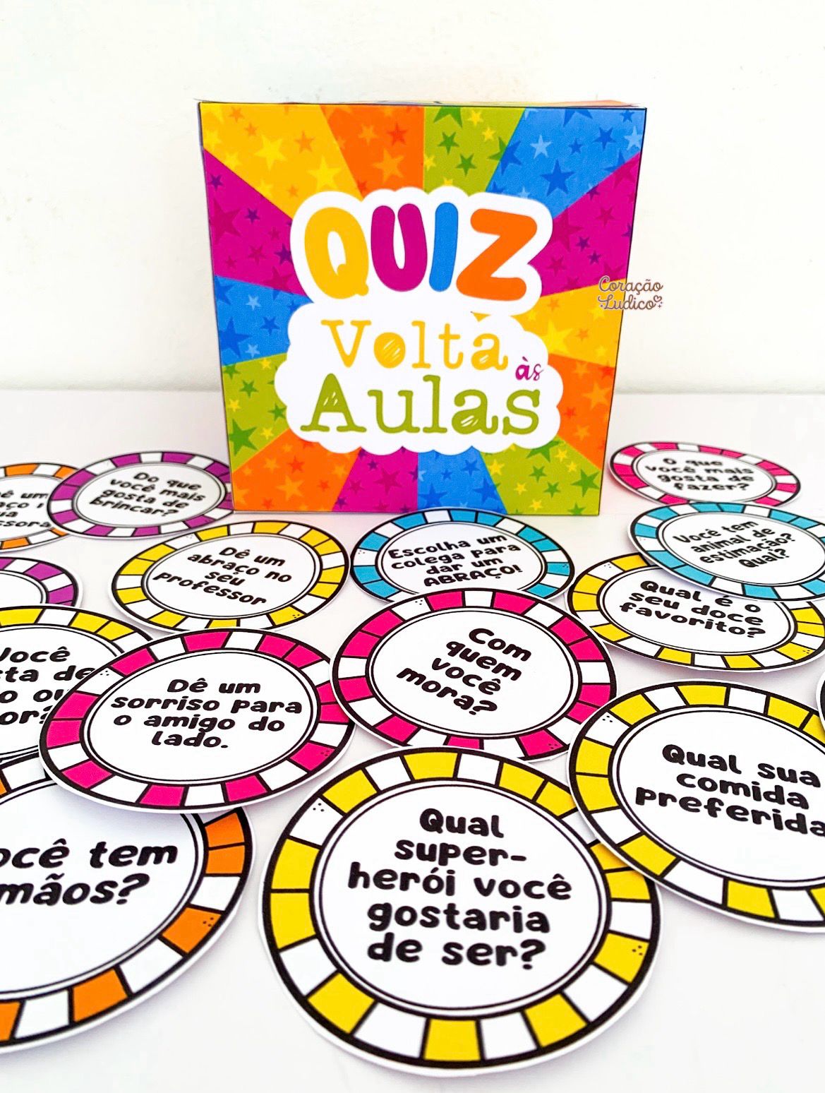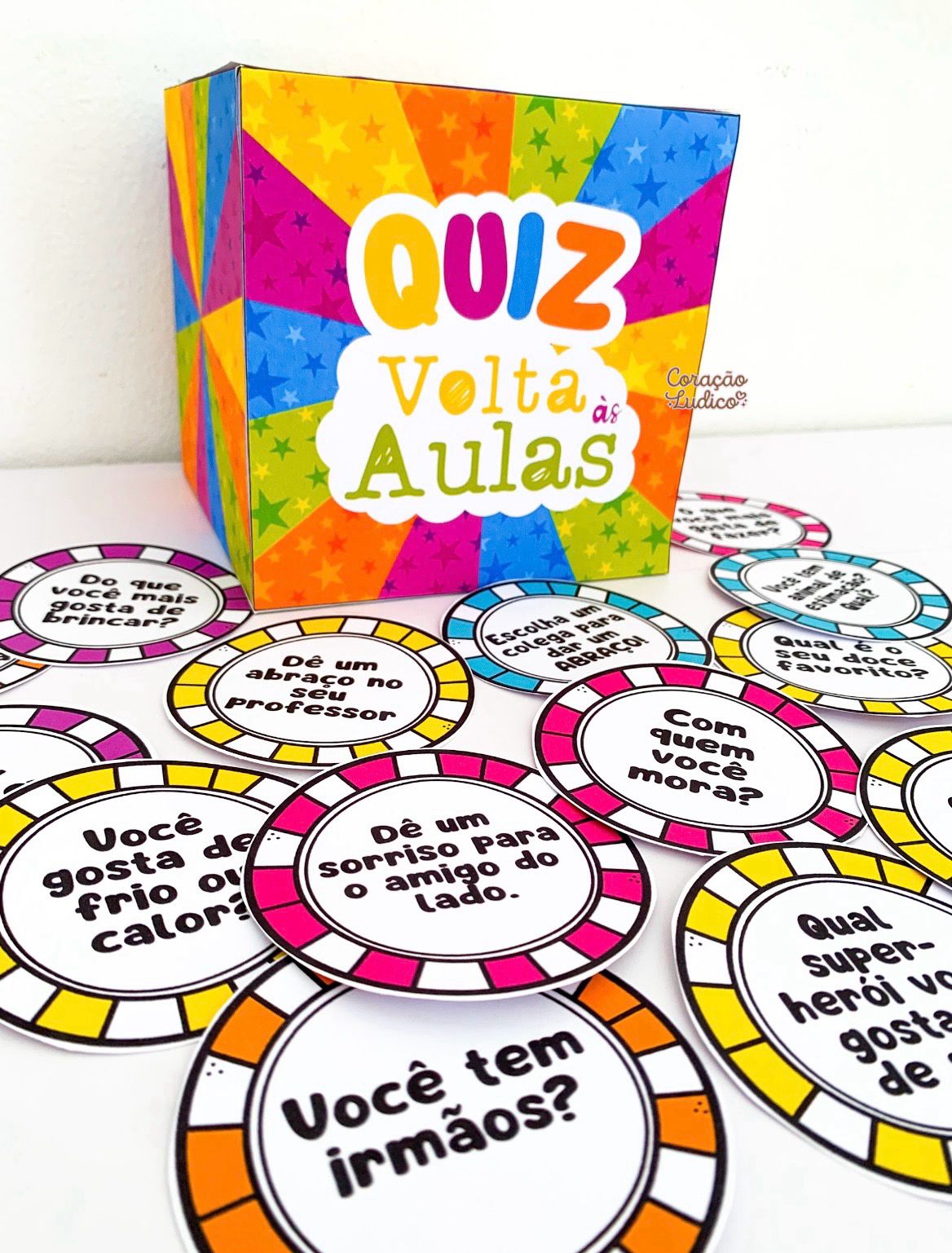 30 fichas coloridas com perguntas interativas.